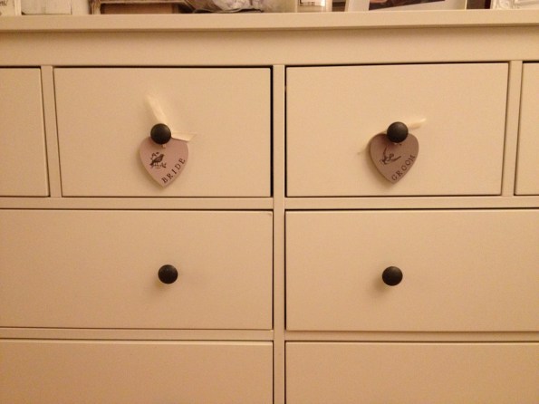 I can’t remember how I initially got the idea for these wedding favours-come-table names. But I am always hanging little heart decorations on door knobs and dimmer switches (much to husband’s annoyance), so it probably grew from there.